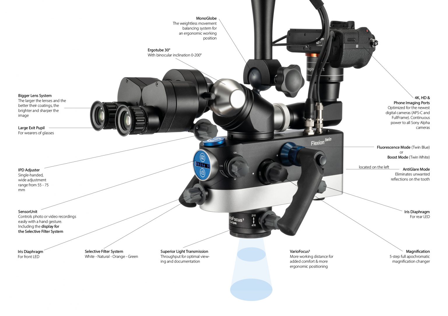 | Illumination System | Twin Blue: Up to 100.000 Lux (white rear LED) Fluorescence (dark blue front LED) |