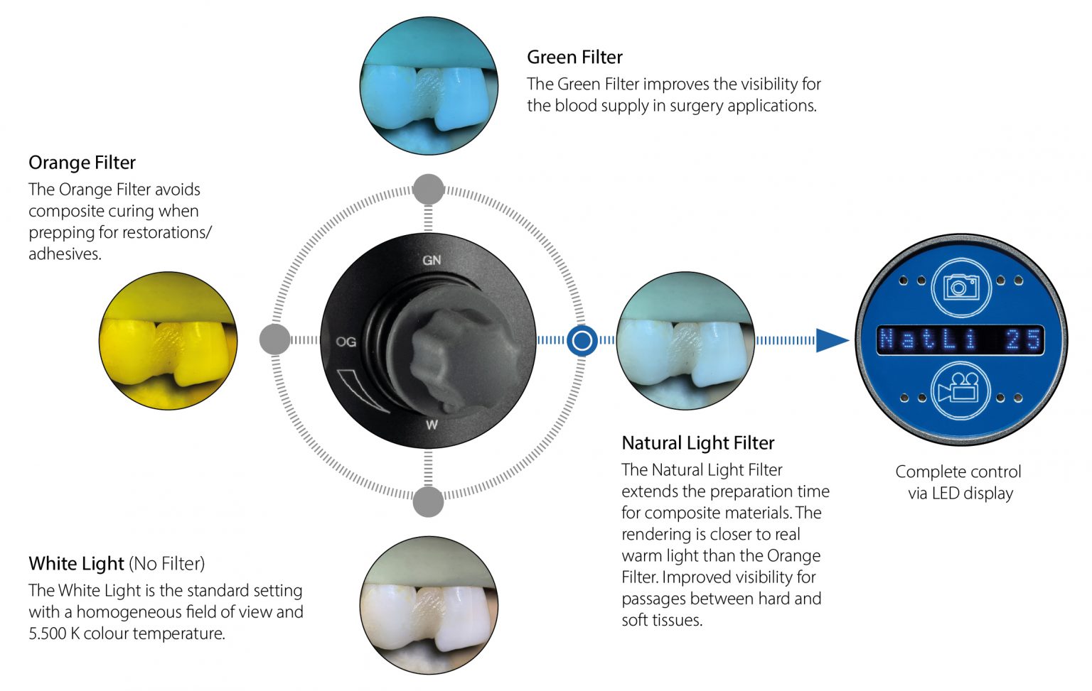 | Selective Filter System | Natural Light Filter Orange Filter Green Filter White Light (no filter) (Settings via joystick) Polarization Filter (combinable with white rear LED only) LED control display |